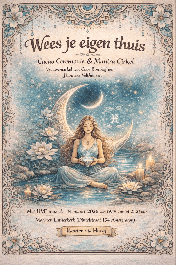 De eerstvolgende bijeenkomst is een Cacao Ceremonie en Mantracirkel in de Maarten Lutherkerk in Amsterdam op 14 maart 2026 om 19.19 uur. Aanmelden via Hipsy.
